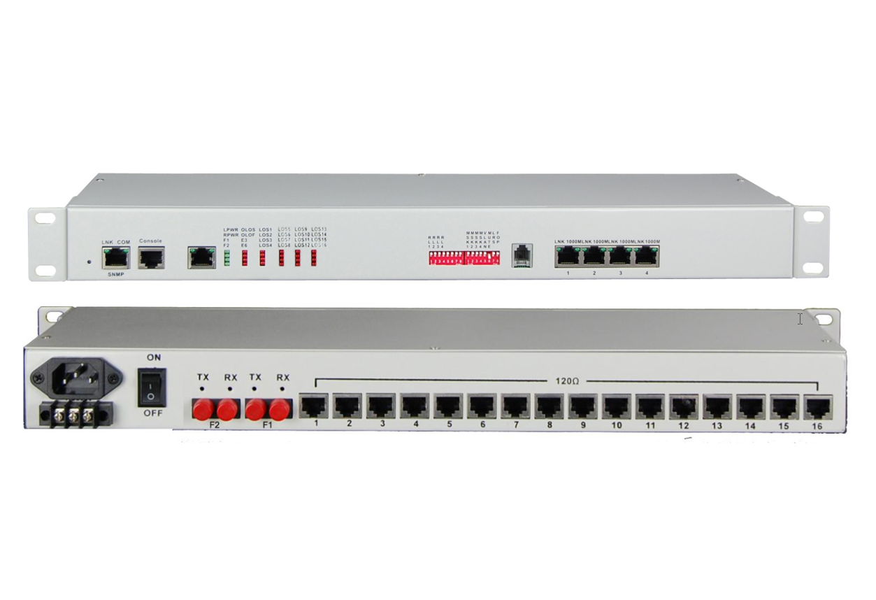 Оптический PDH мультиплексор с 4х 1G RJ-45 Ethernet портами, 16x E1 портами, 2х оптическими портами